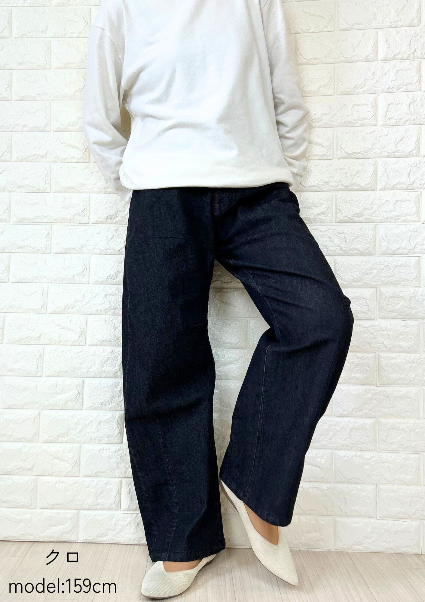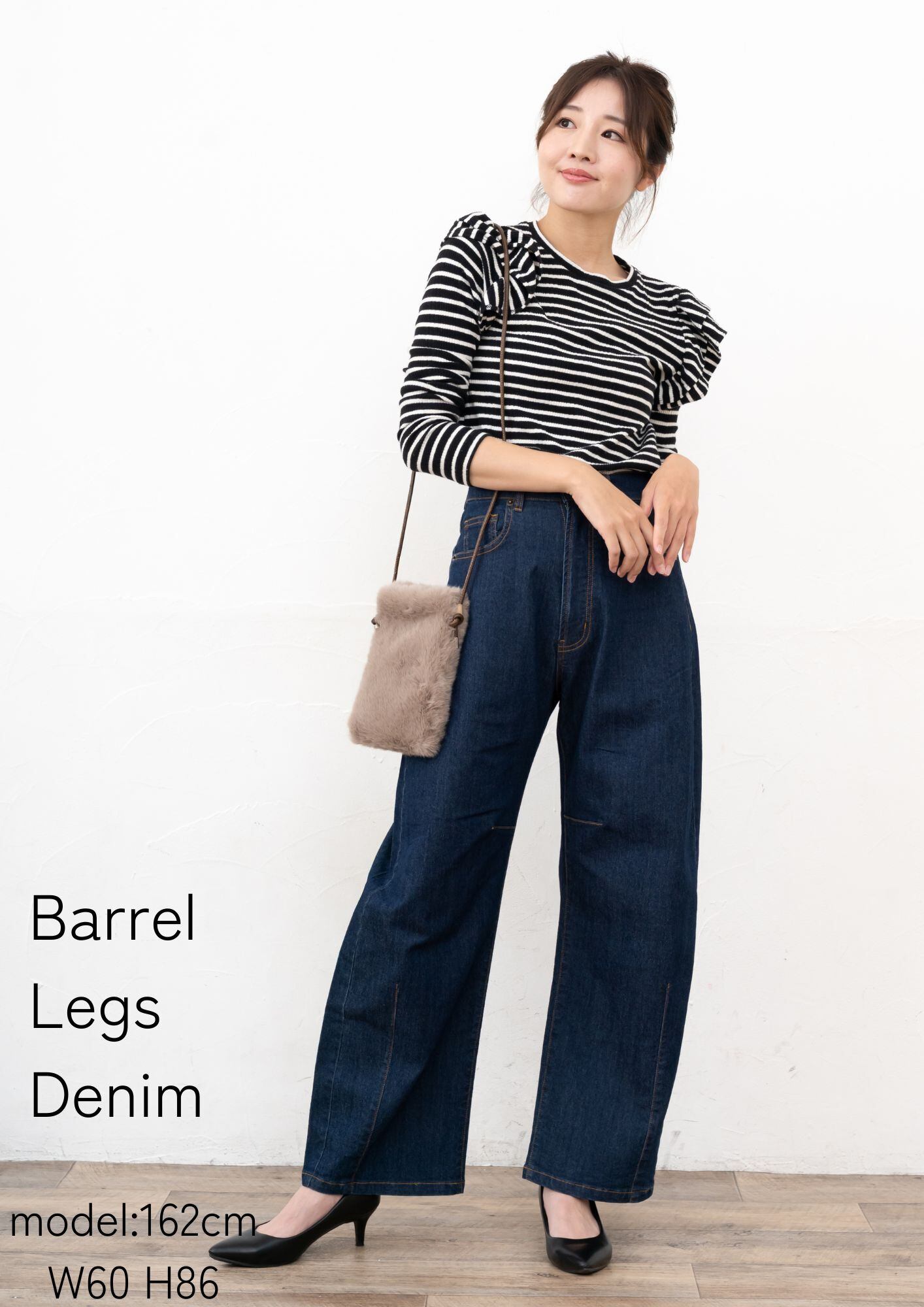 360°ストレッチデニムのバレルレッグパンツ。ウエストもゴム無しですっきりシルエット