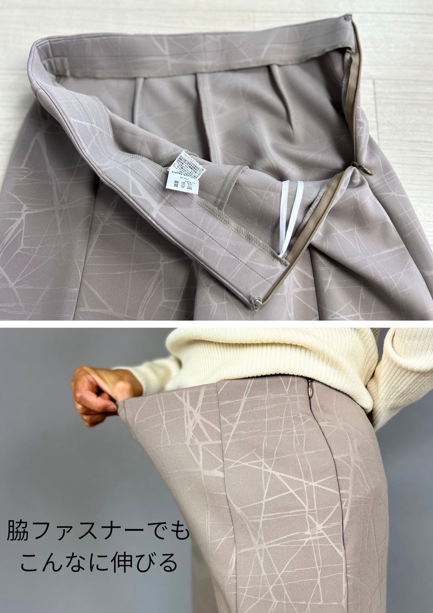 脇のカーブ切り替えでキレイ目ラインを実現。シャドウプリントでトップスとの相性も〇