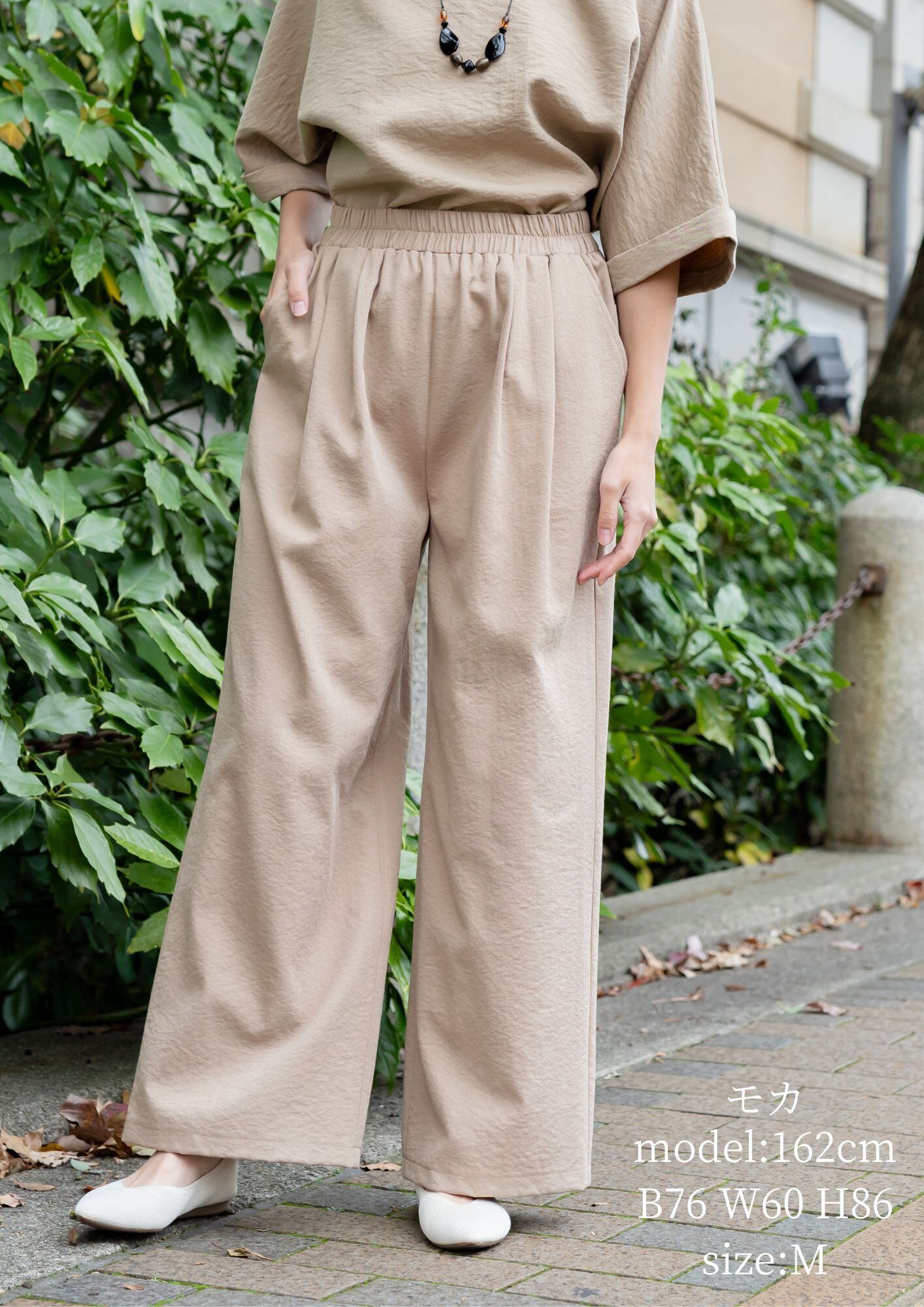 ウエストはゴム仕様で、伸縮性があるため動きやすさを実現!ゆったりとしたシルエットが体型を美しく引き立て、リラックス感を演出します。取扱いも簡単で、デイリー使いにぴったりのパンツです。
