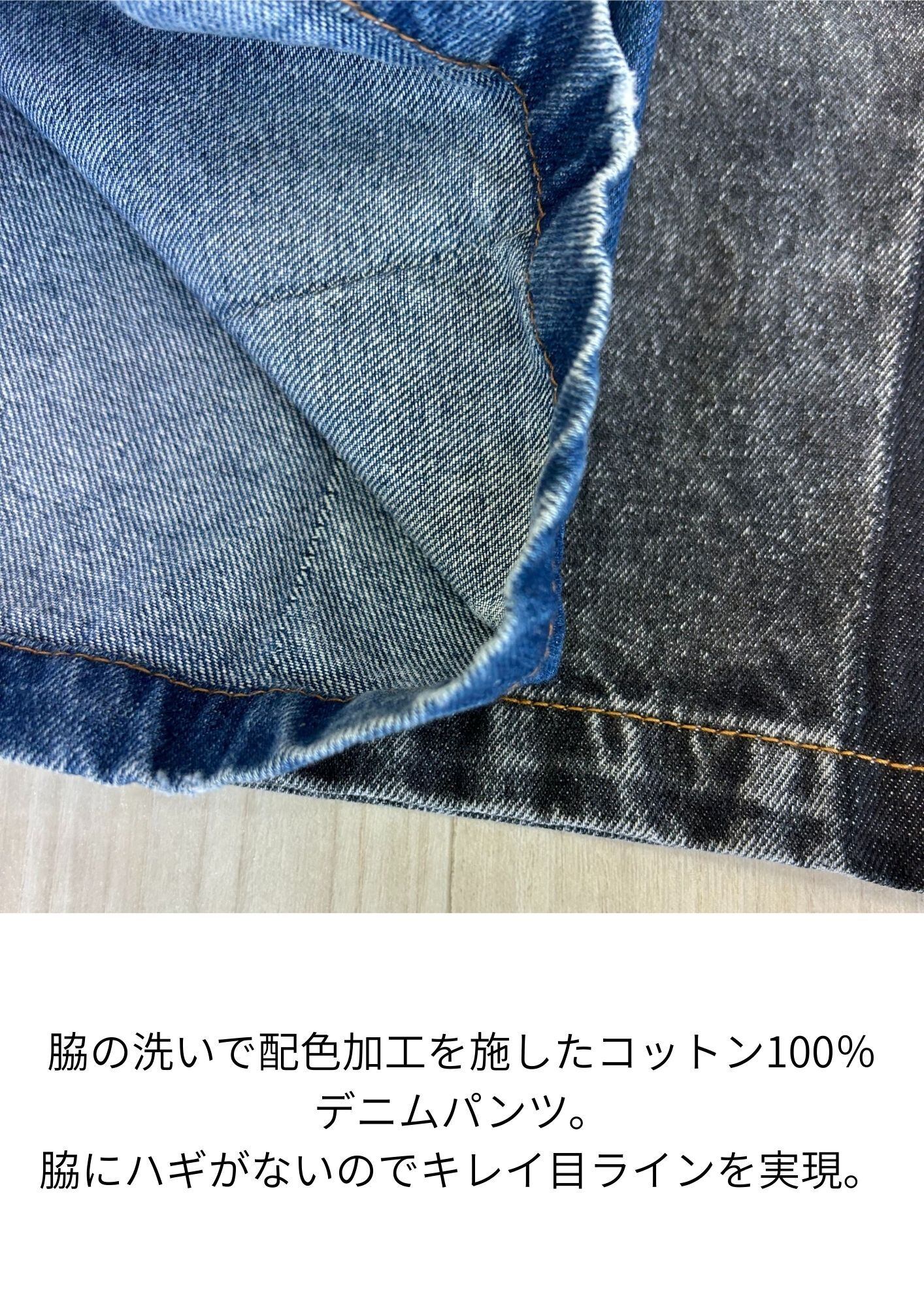 脇の洗いで配色加工を施したコットン100%デニムパンツ。前ファスナーあきで履きやすい