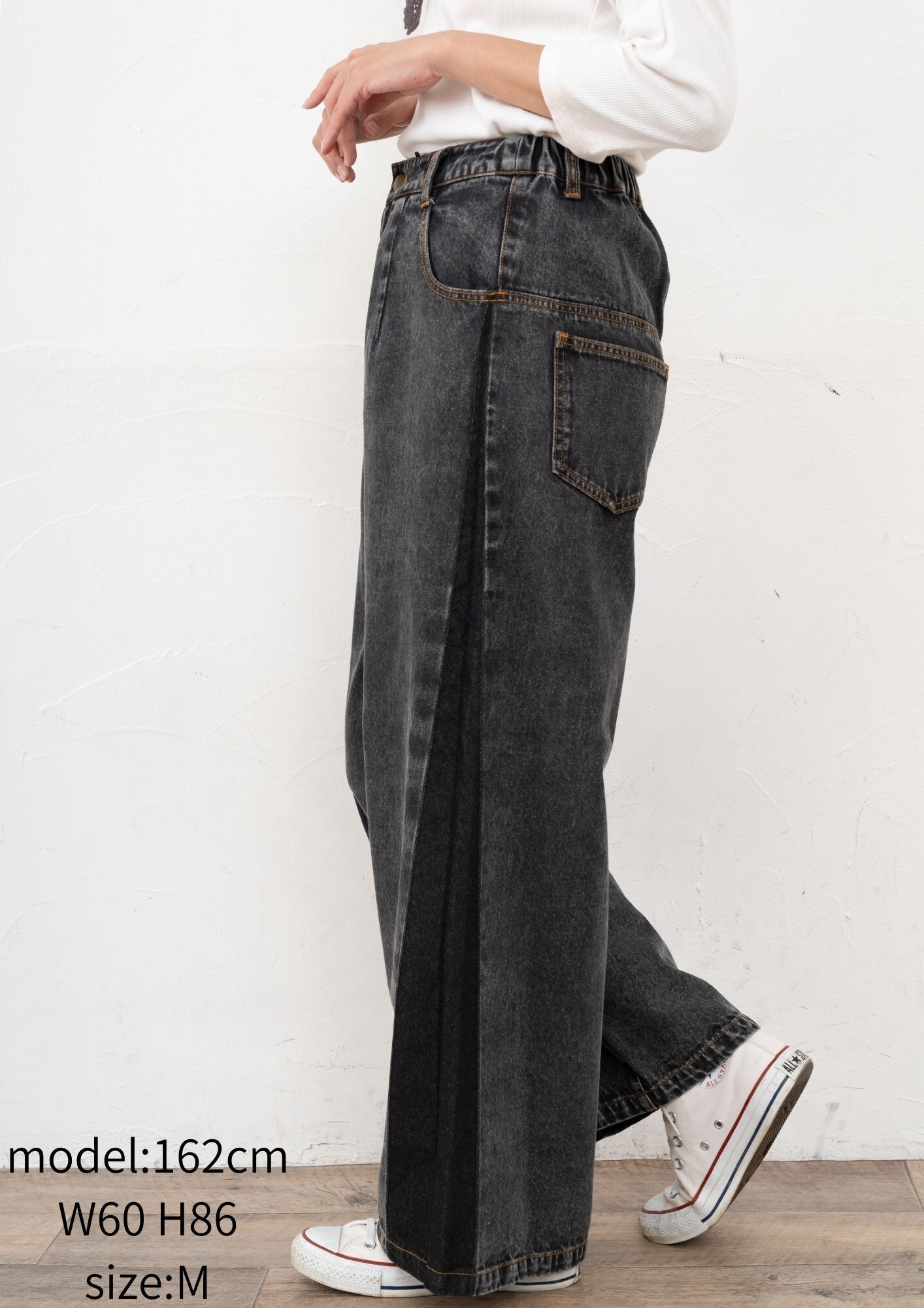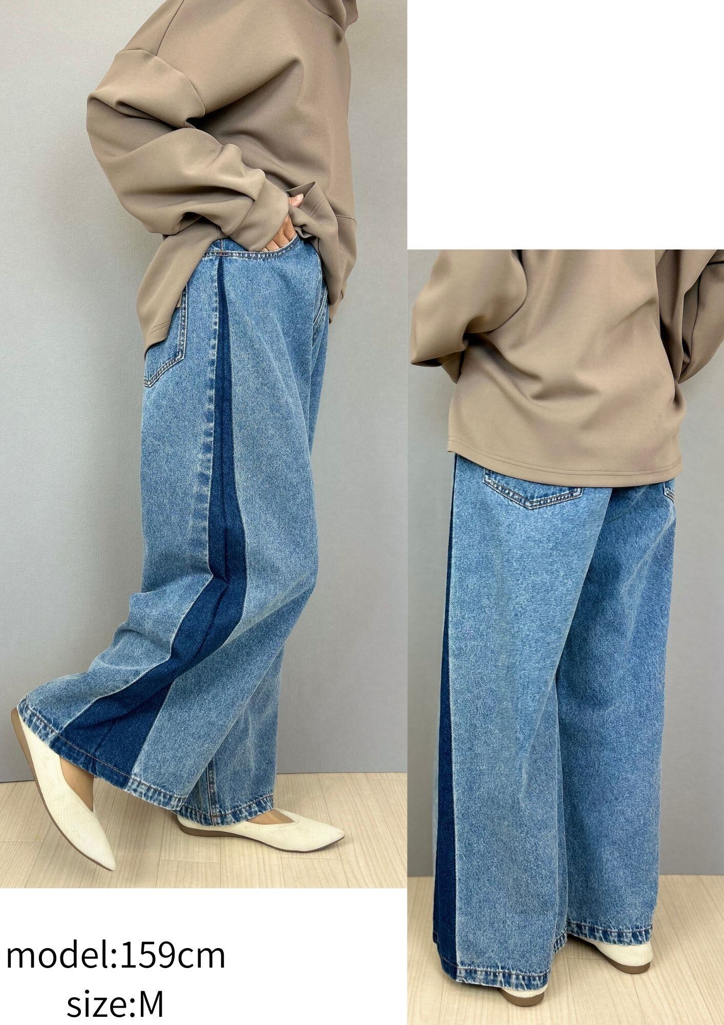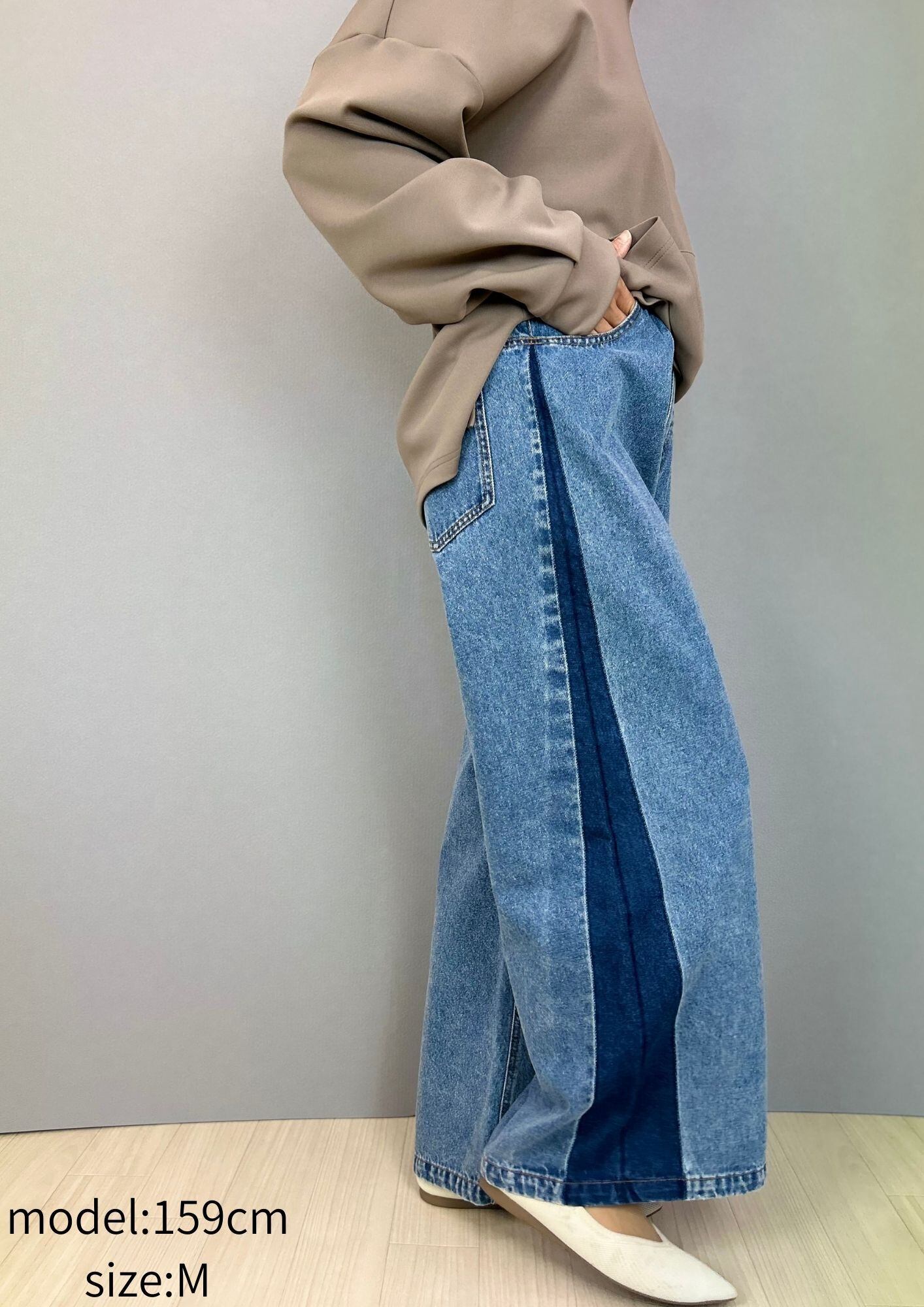 ワイドデニムパンツ No45018 前ファスナー ウエストバックゴム 前後ポケット S~Ⅼ 脇配色