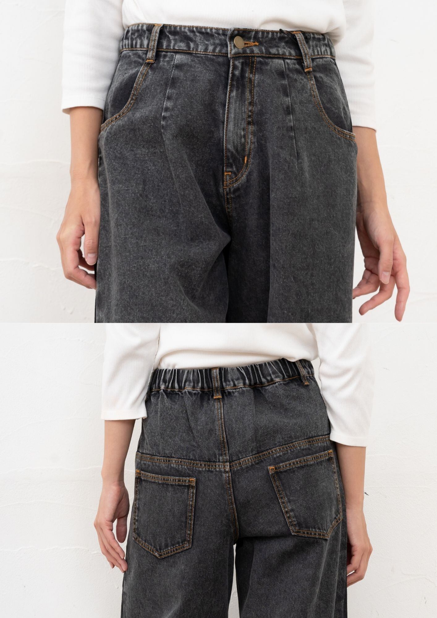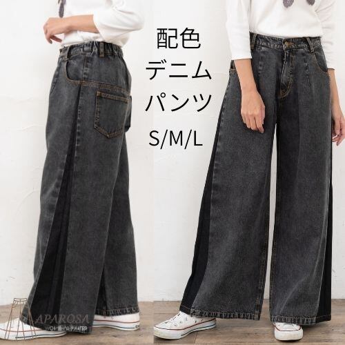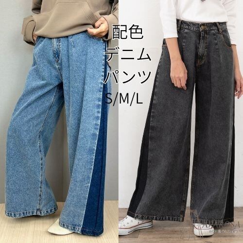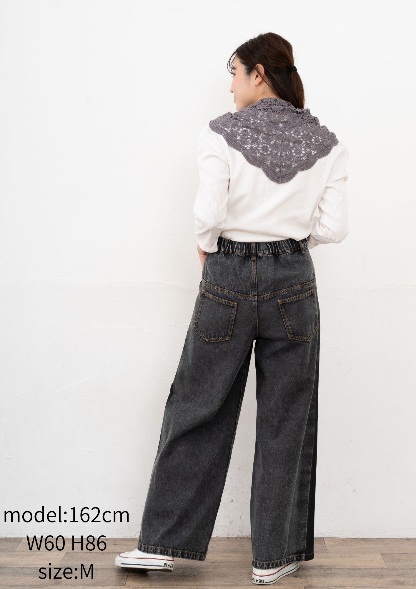 ワイドデニムパンツ No45018 前ファスナー ウエストバックゴム 前後ポケット S~Ⅼ 脇配色
