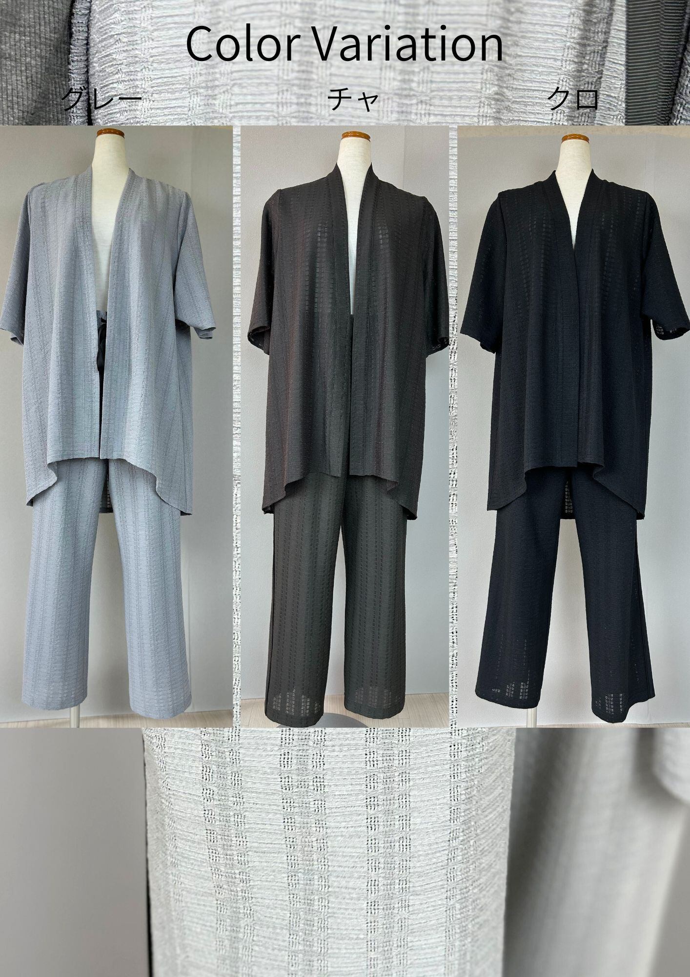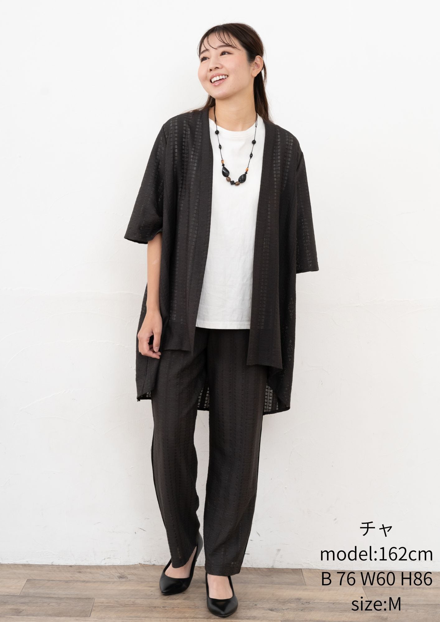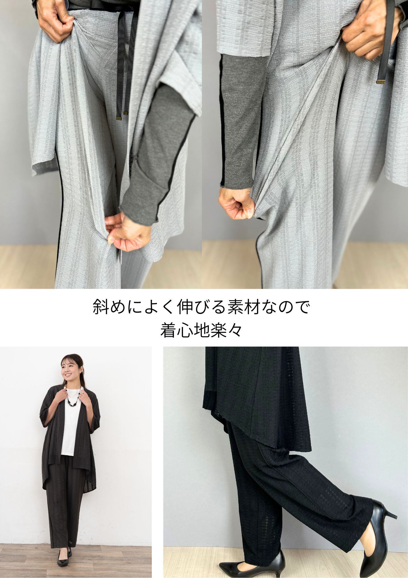 しなやかな素材感が特徴で、柔らかい肌触りが心地よく、リラックスした着こなしが楽しめます。単品でも、同素材のアイテムと合わせれば、より洗練されたコーディネートに。普段使いから特別な日まで幅広く活躍すること間違いなし!