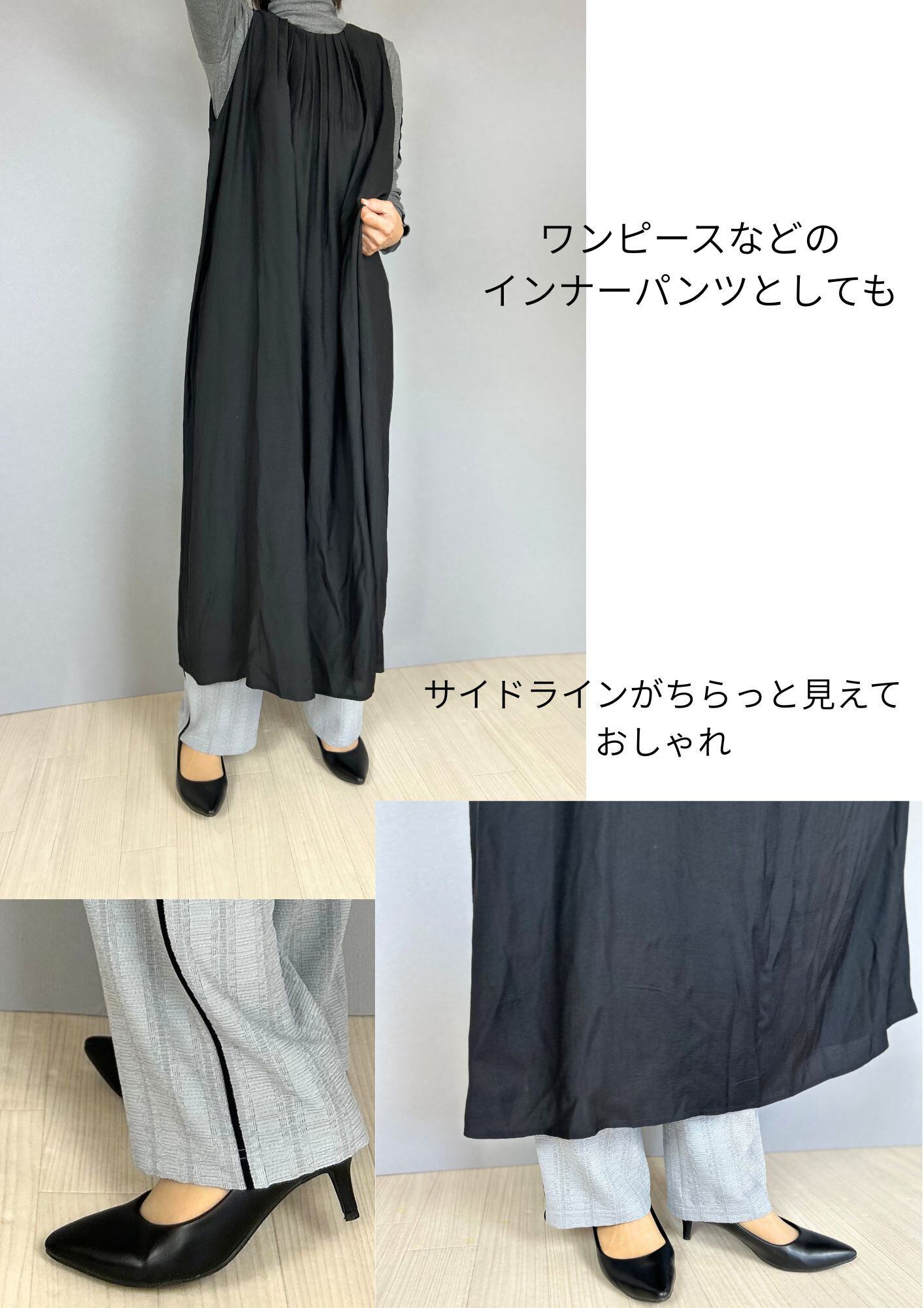 無地見えするチェックレースがシンプルな印象 裏地付きで安心 ウエスト紐と脇のラインがポイント ストレッチが効いて機能的 同素材の6分袖カーディガンあり